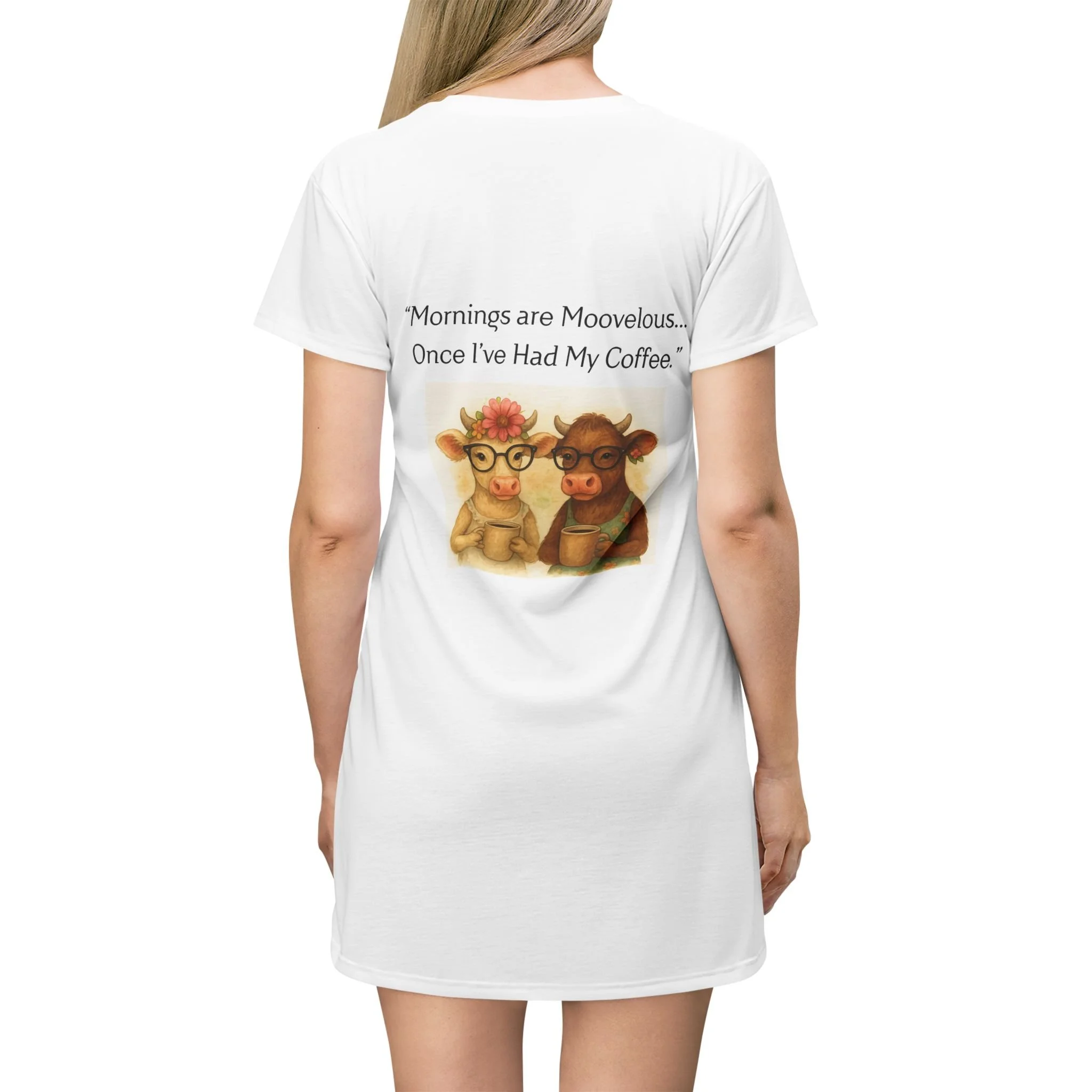 Soft and breezy, this lightweight dress brings a wink of farmhouse humor to slow mornings and lazy weekends. The front chest features a tiny coffee cup and heart, while the back shows two cozy cows sharing a warm mug and the line “Mornings are Moovelous… Once I’ve Had My Coffee.” It drapes casually over the body and moves easily — wear it for coffee runs, porch sittin’, or relaxed days at home when comfort and a little whimsy matter most. The breathable polyester keeps the print bright and the shape steady, so the cheeky artwork stays cheerful wash after wash.