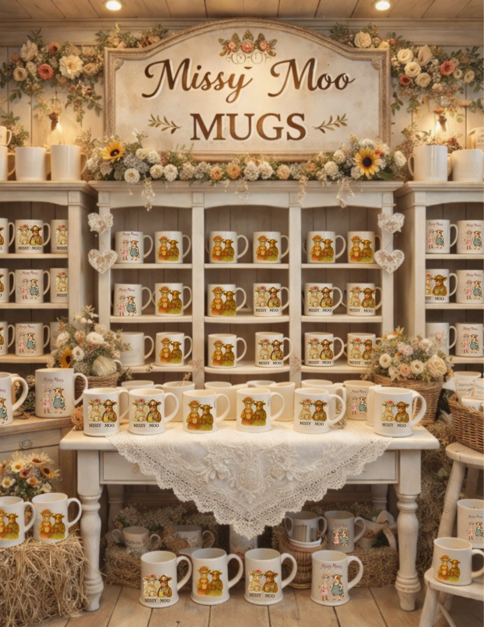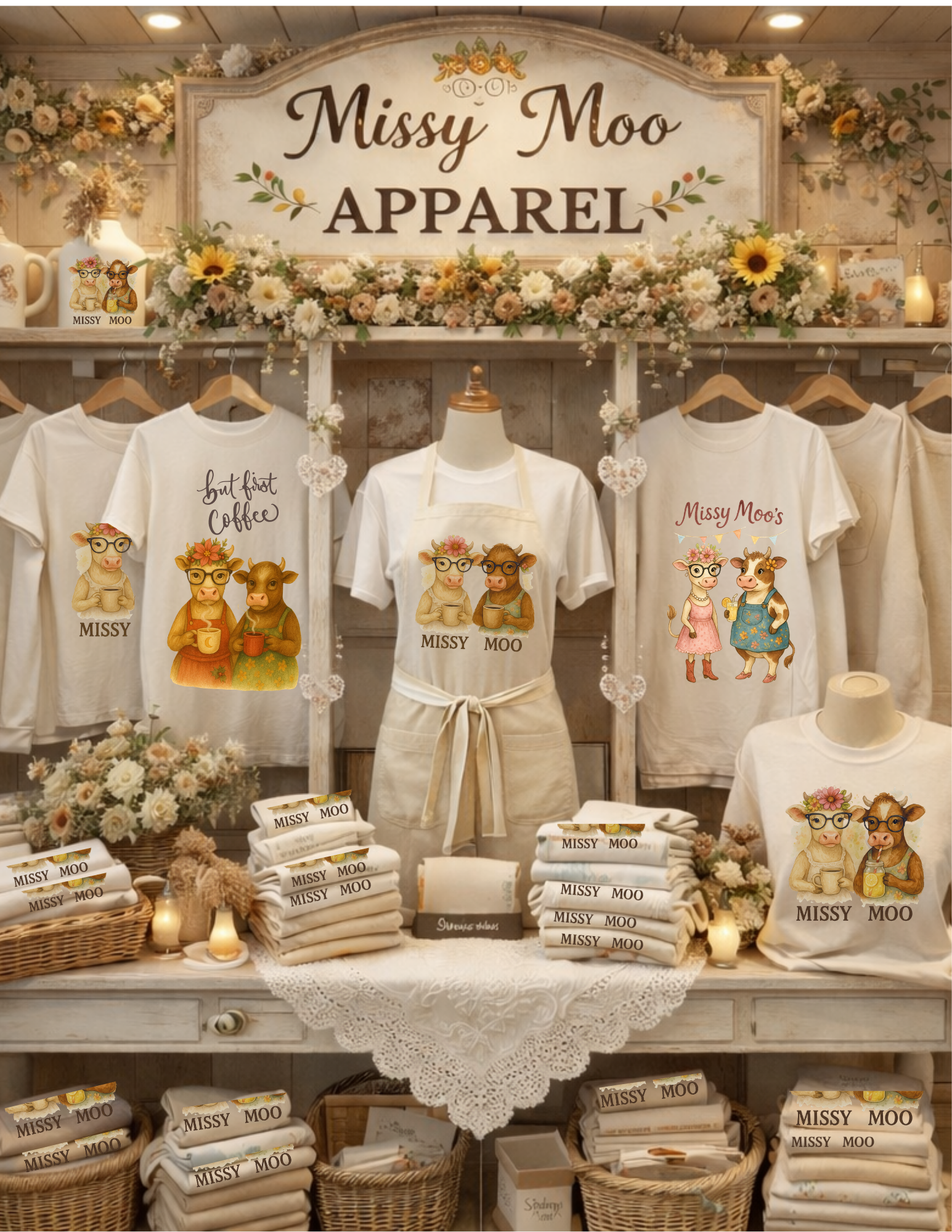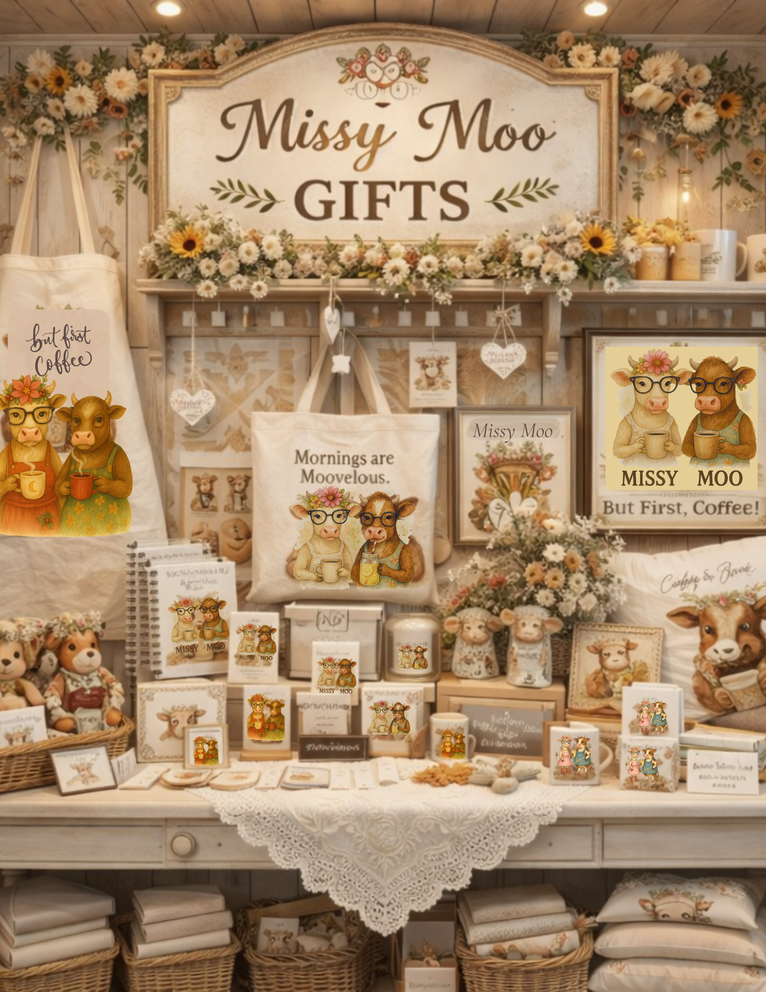 Missy Moo began as a simple sketch, born somewhere between a quiet morning coffee and a dream of a softer, slower life. With her gentle eyes and signature touch of rustic charm, she became more than an illustration — she became a feeling. Missy Moo represents cozy kitchens, warm mugs held in both hands, laughter drifting through farmhouse light, and the belief that everyday rituals can be beautiful. In her world, comfort and whimsy live side by side, reminding us that even the smallest moments — a sip, a pause, a breath — can feel like home.