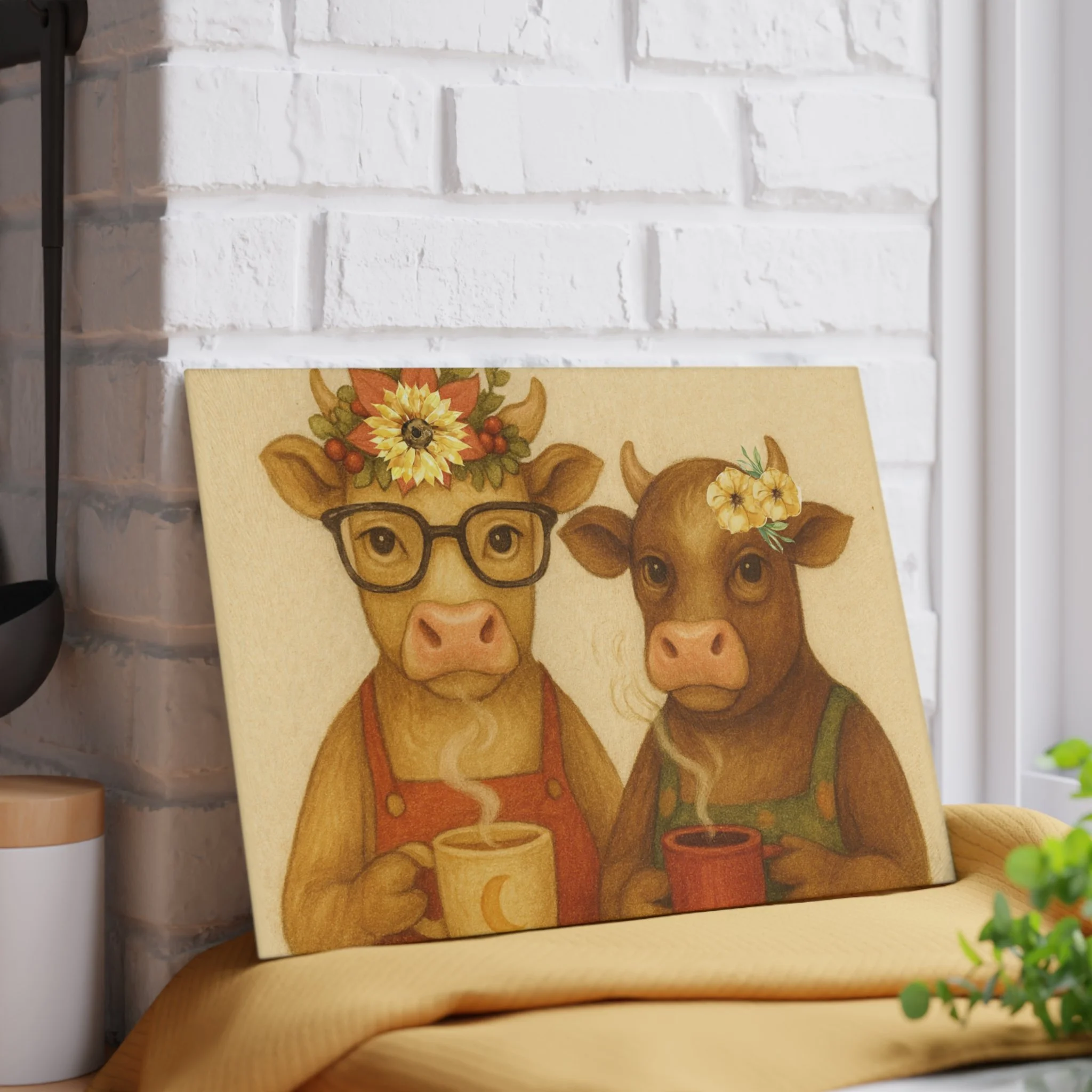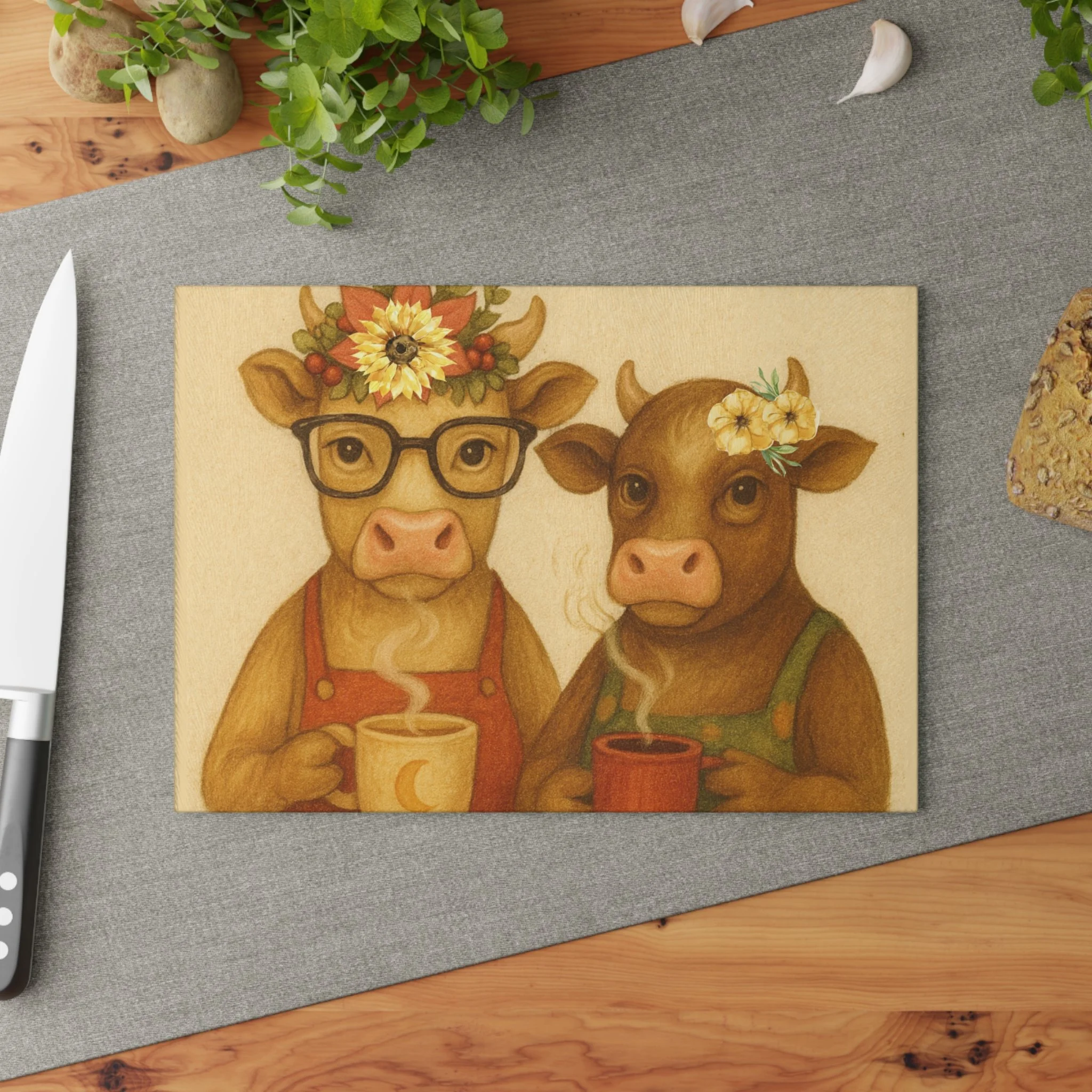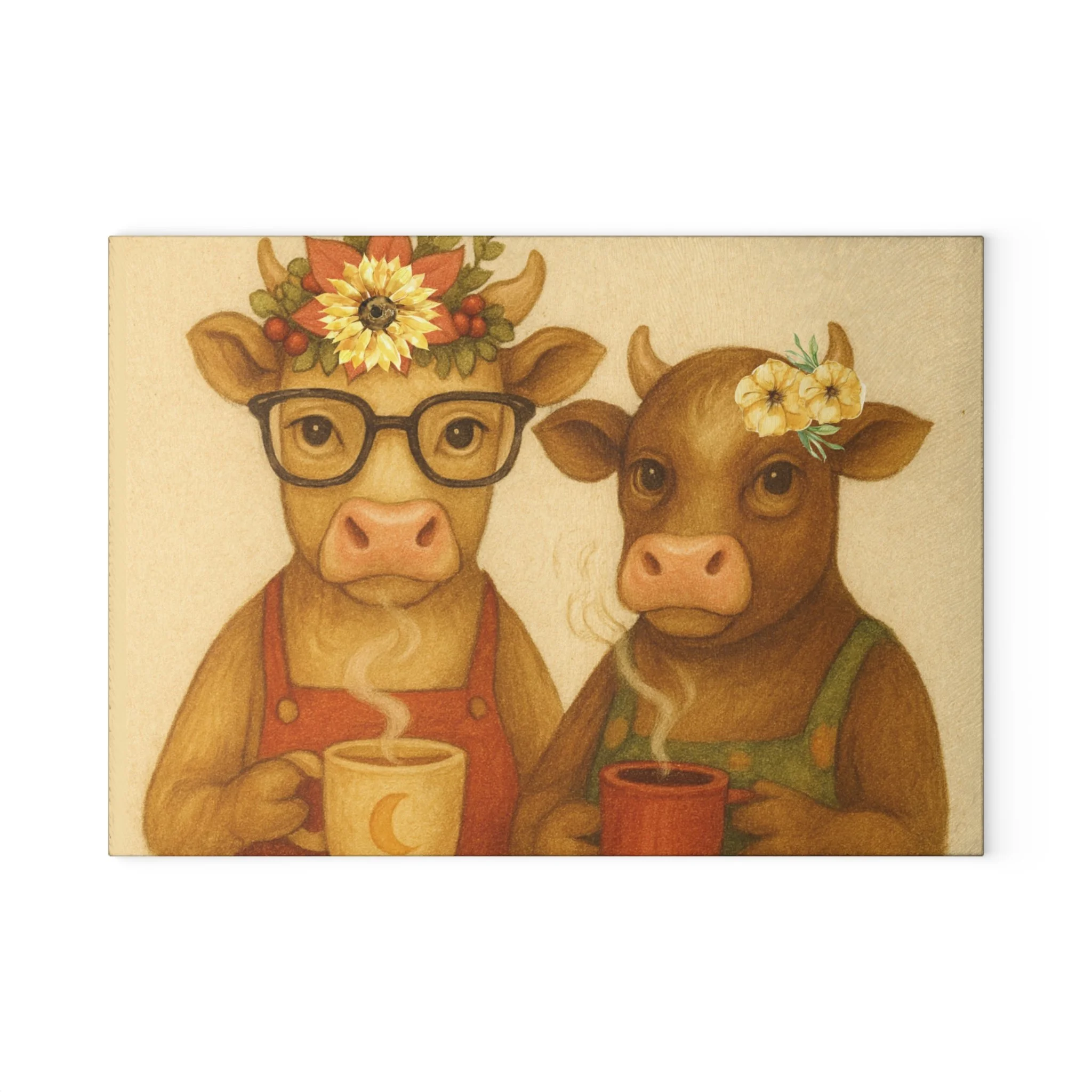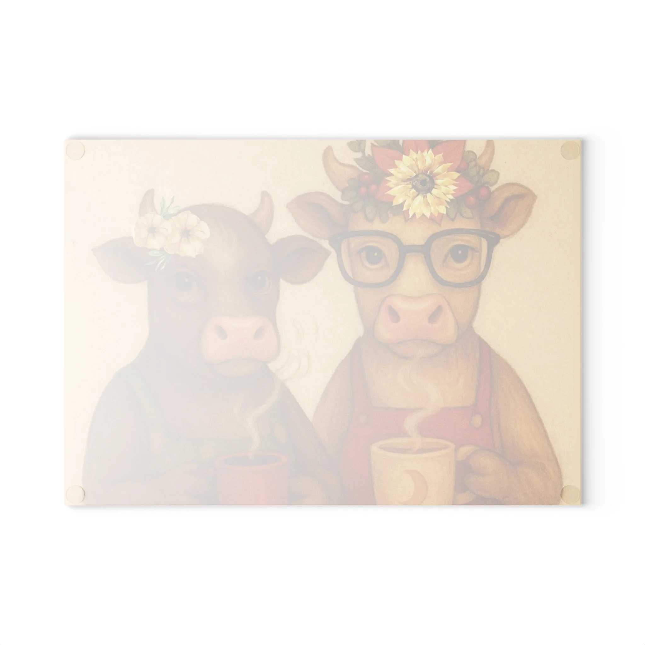 Warm, whimsical, and decidedly cozy — this tempered glass cutting board brings a slice of farmhouse charm to your kitchen. Two sweet cows, one in glasses and a flower crown, hold steaming mugs as if sharing a slow morning together. The textured, durable glass surface keeps the printed art vivid while standing up to everyday meal prep. Four rubber feet keep the board steady on countertops, and the smooth tempered glass wipes clean in a flash. Pick the size that fits your prep space and let this little scene anchor coffee rituals, quick snacks, and afternoons spent chopping and chatting.