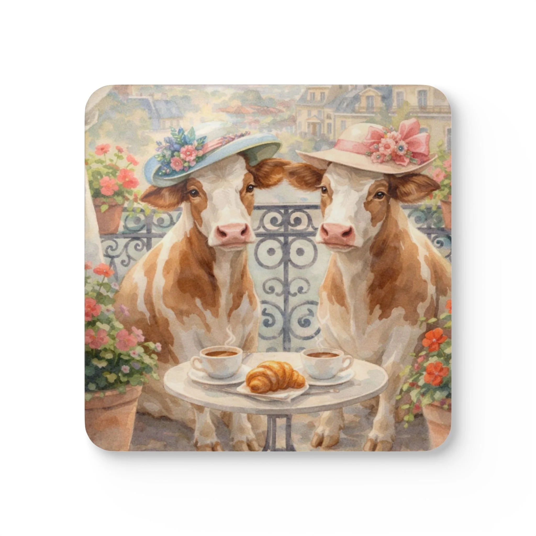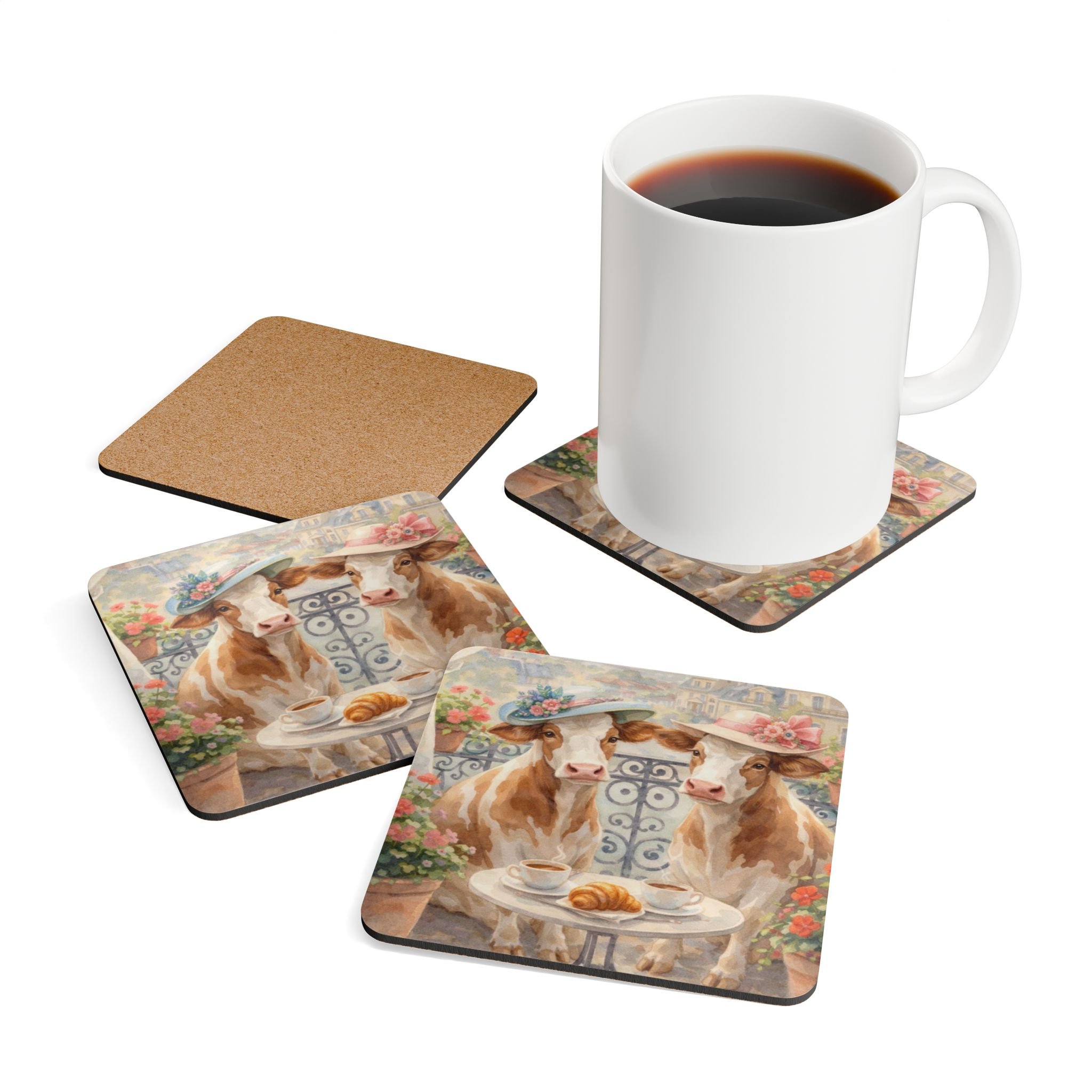 A lovely accent for country kitchens, cottage-inspired homes, and anyone who believes even the smallest details should feel beautiful. Bright, cottage-core coasters that bring a sunny, whimsical mood to your table. Each 3.75" square features a glossy, full-color illustration of two hat-wearing cows sharing coffee and a croissant on a floral balcony—small scenes that invite a slow morning and a smile. The high-gloss MDF top keeps colors vivid; the cork backing grips surfaces so cups stay put. They arrive as a set of four, ready to tuck into a farmhouse kitchen, a cozy tea corner, or a cheerful housewarming basket.