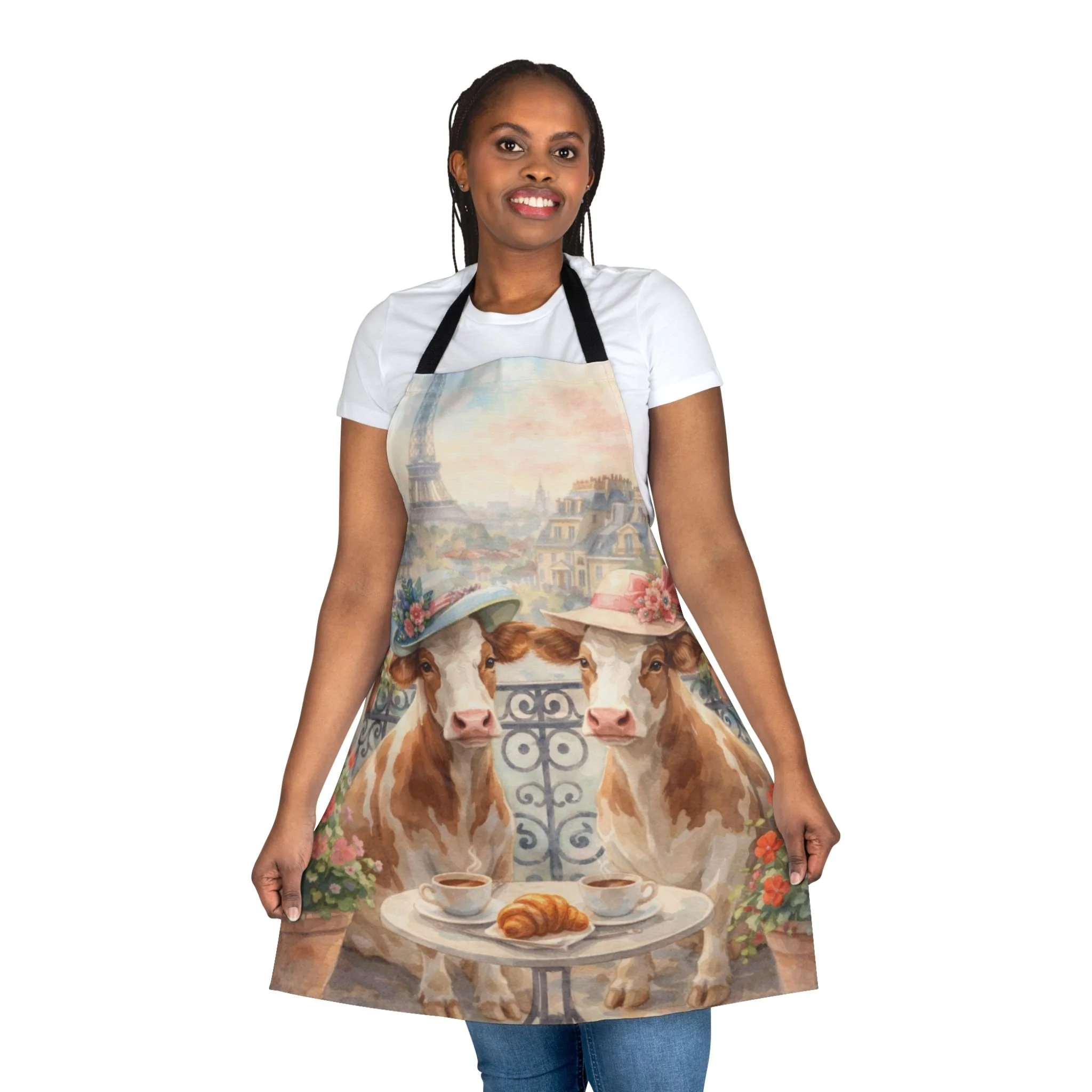 Lighthearted yet refined, this apron transforms everyday kitchen rituals into something that feels stylish, creative, and just a little bit Parisian.Warm, whimsical, and a little bit fancy — this printed apron turns everyday cooking into a slow, sunny moment on a Parisian balcony. Two gentle cows in floral hats share coffee and a croissant against a soft, pastel backdrop of the Eiffel Tower. The fine-weave polyester canvas feels smooth and slightly cushioned, so it wears like a cozy layer while keeping splatters and messes at bay. Choose from five strap colors to match your kitchen mood. Wear it for a quiet weekend breakfast, messy baking projects, or when hosting friends who appreciate a touch of countryside charm with city romance.