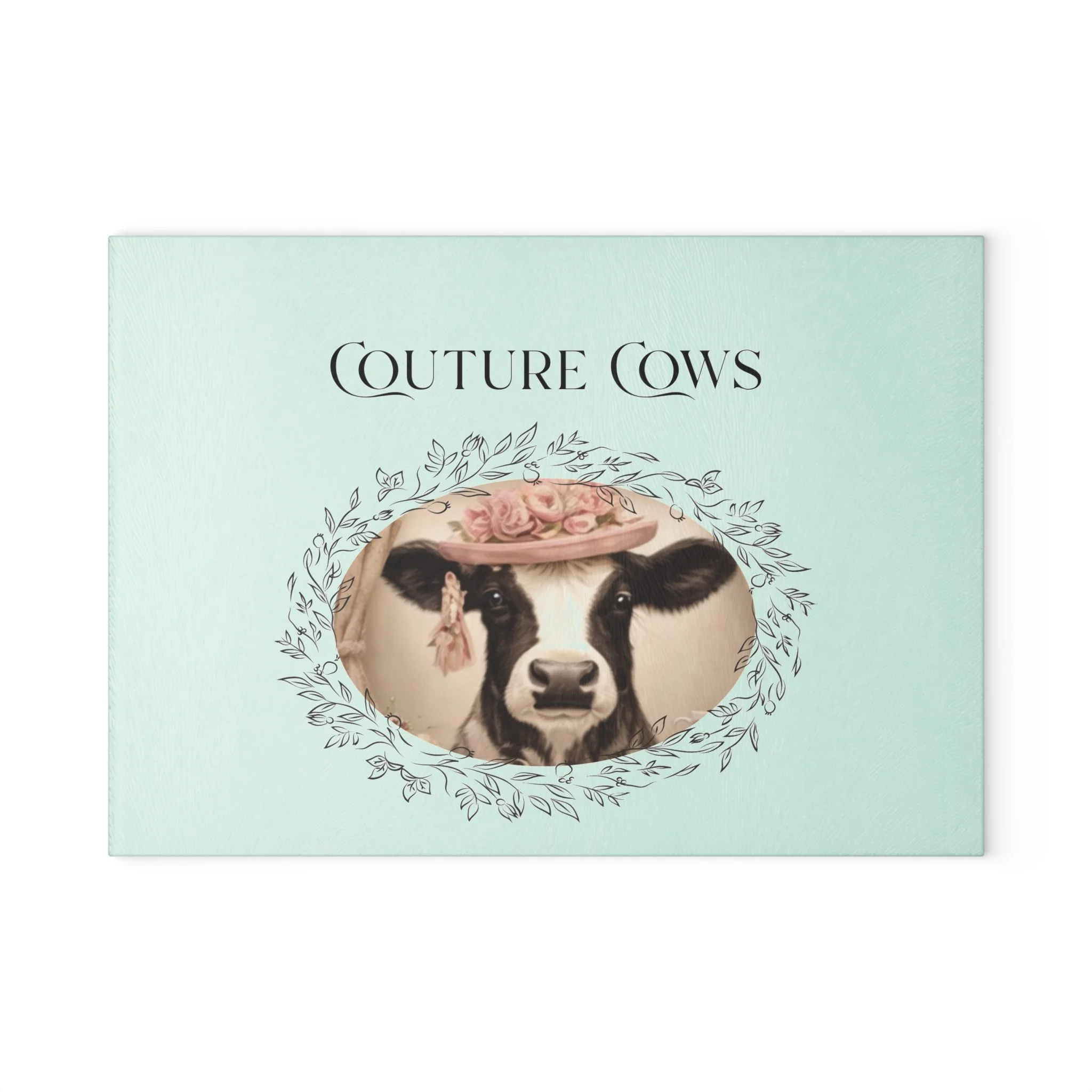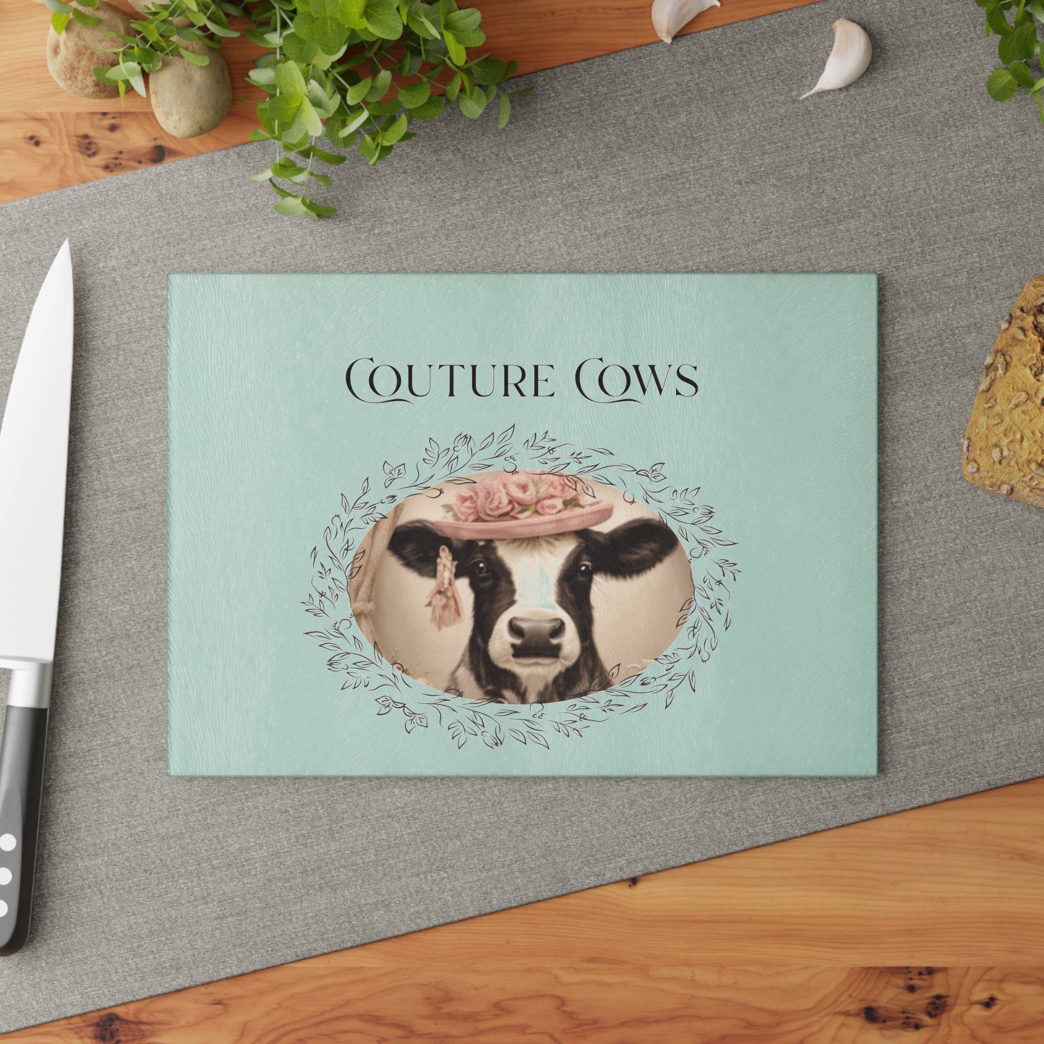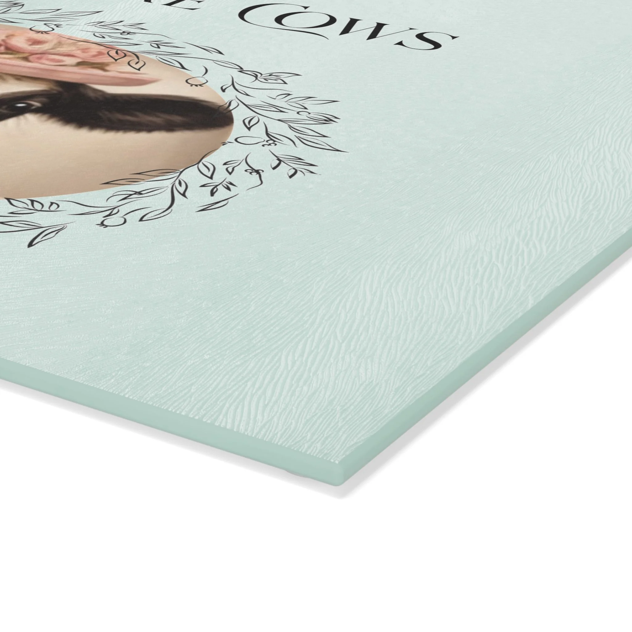Add a playful, vintage touch to everyday kitchen prep with this glass cutting board featuring a whimsical couture cow motif. Soft mint background, delicate wreath frame, and a hand-illustrated cow wearing a floral hat create a charming, farmhouse-meets-french-boutique vibe. The tempered glass surface is smooth yet textured for better grip, and the printed artwork is durable—designed to stay vibrant even with regular use. Small rubber feet keep the board steady on countertops, and two size options let you choose a compact prep piece or a larger serving surface. It’s a cheerful, stylish accent that makes chopping, slicing, and serving feel a little more delightful and decidedly more stylish.